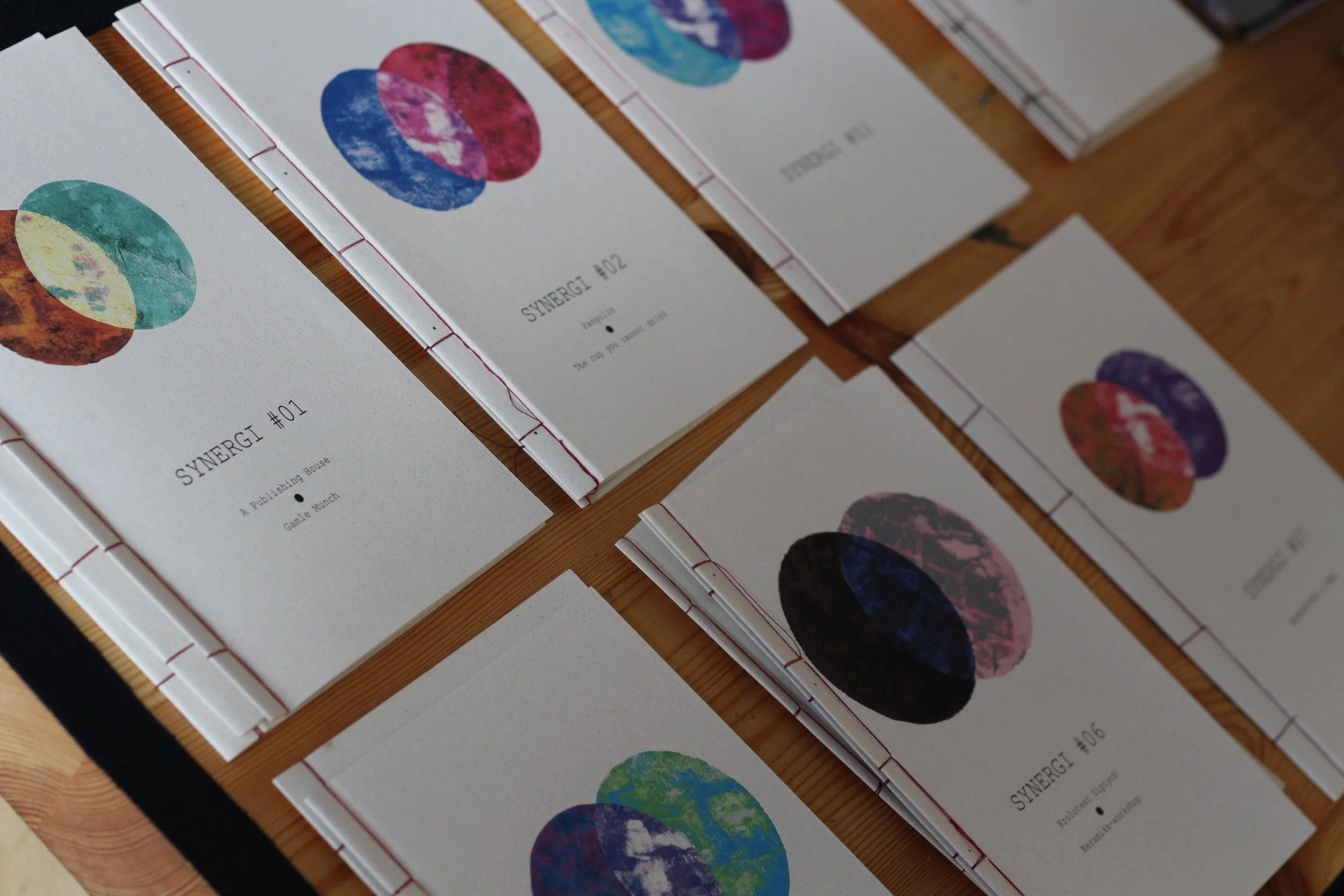 I utstillingen Synergi: Co-Creation hos Kroloftet som vises på Gamle Munch fra 9-21 september 2025, med verk fra arbeidskollektivet Kroloftet, har Trykk forlag satt opp et arbeidsbord hvor de produserer hefter under utstillingen.